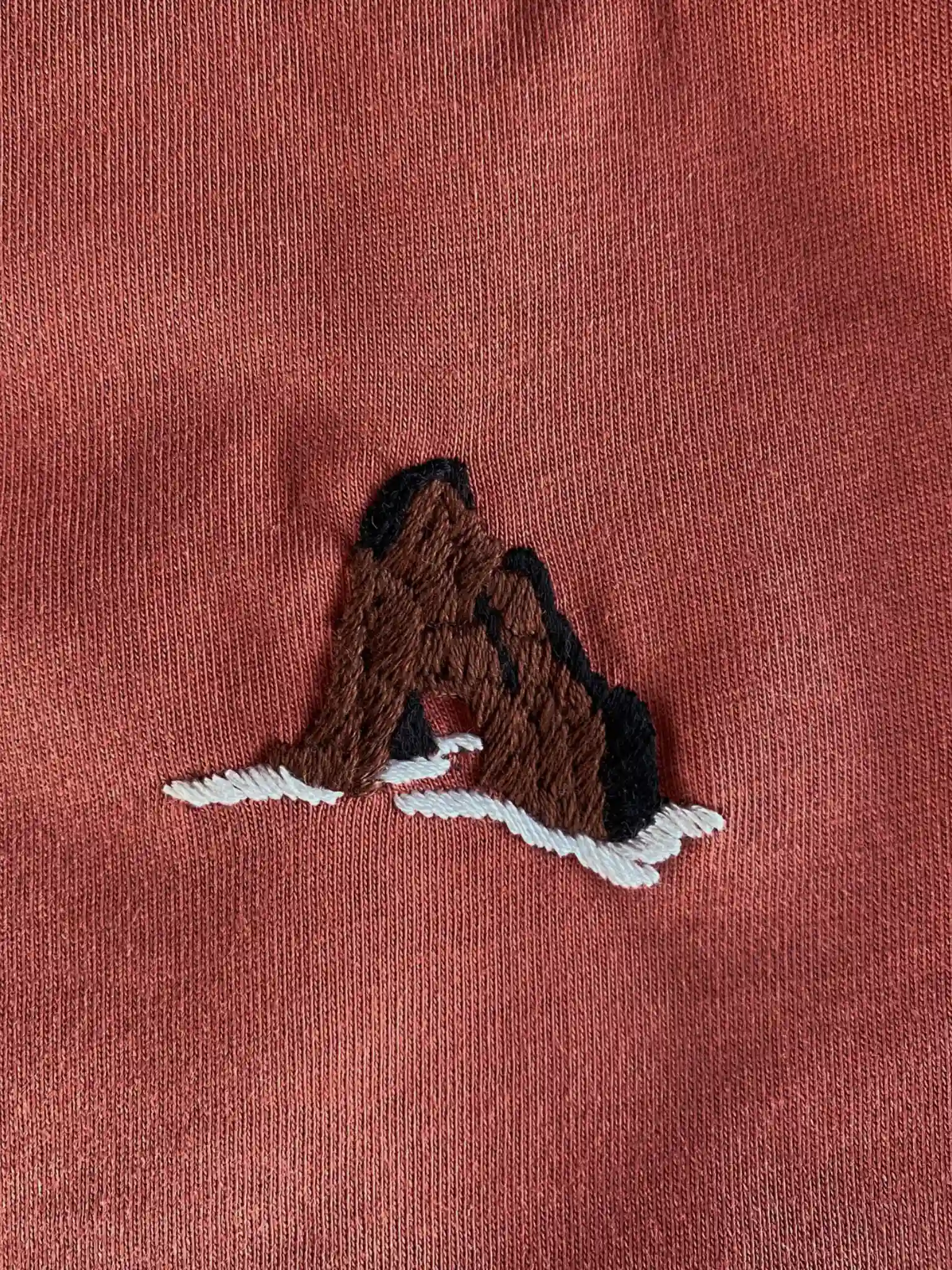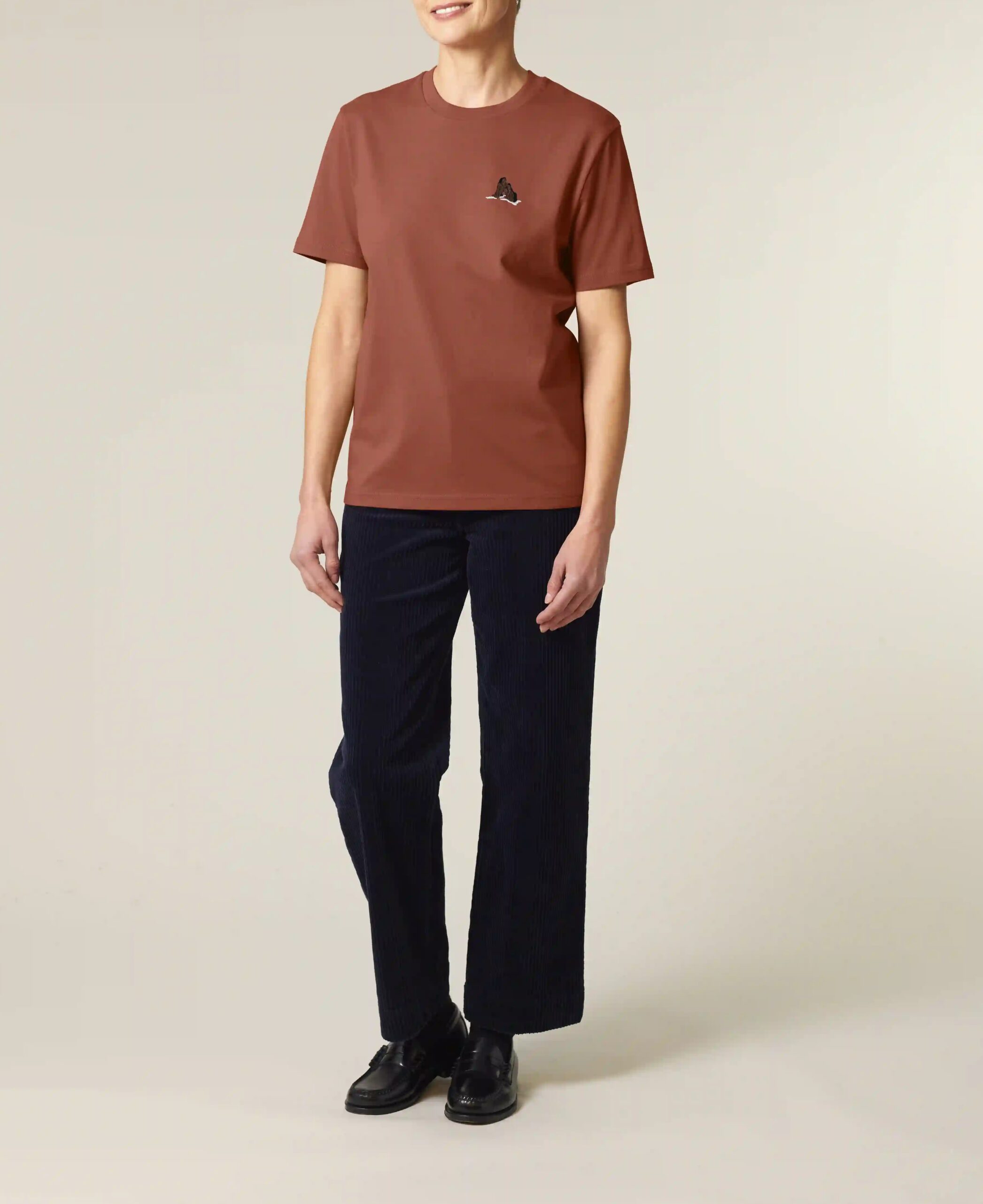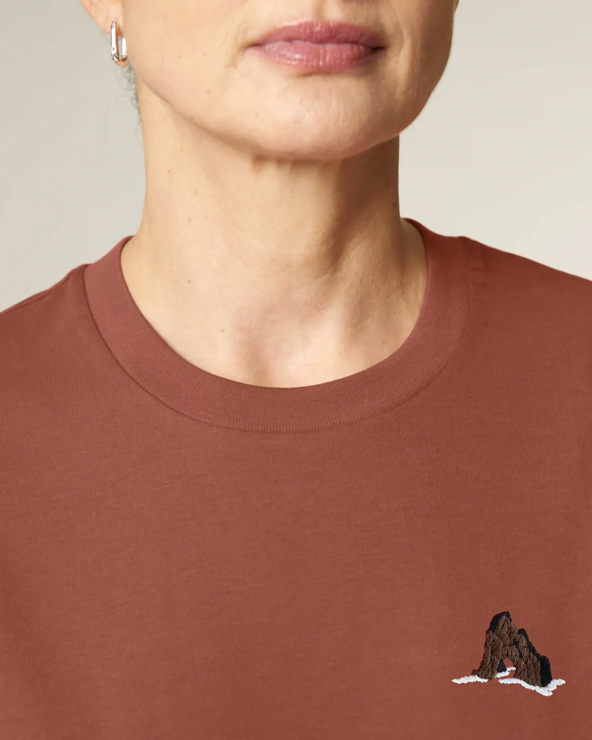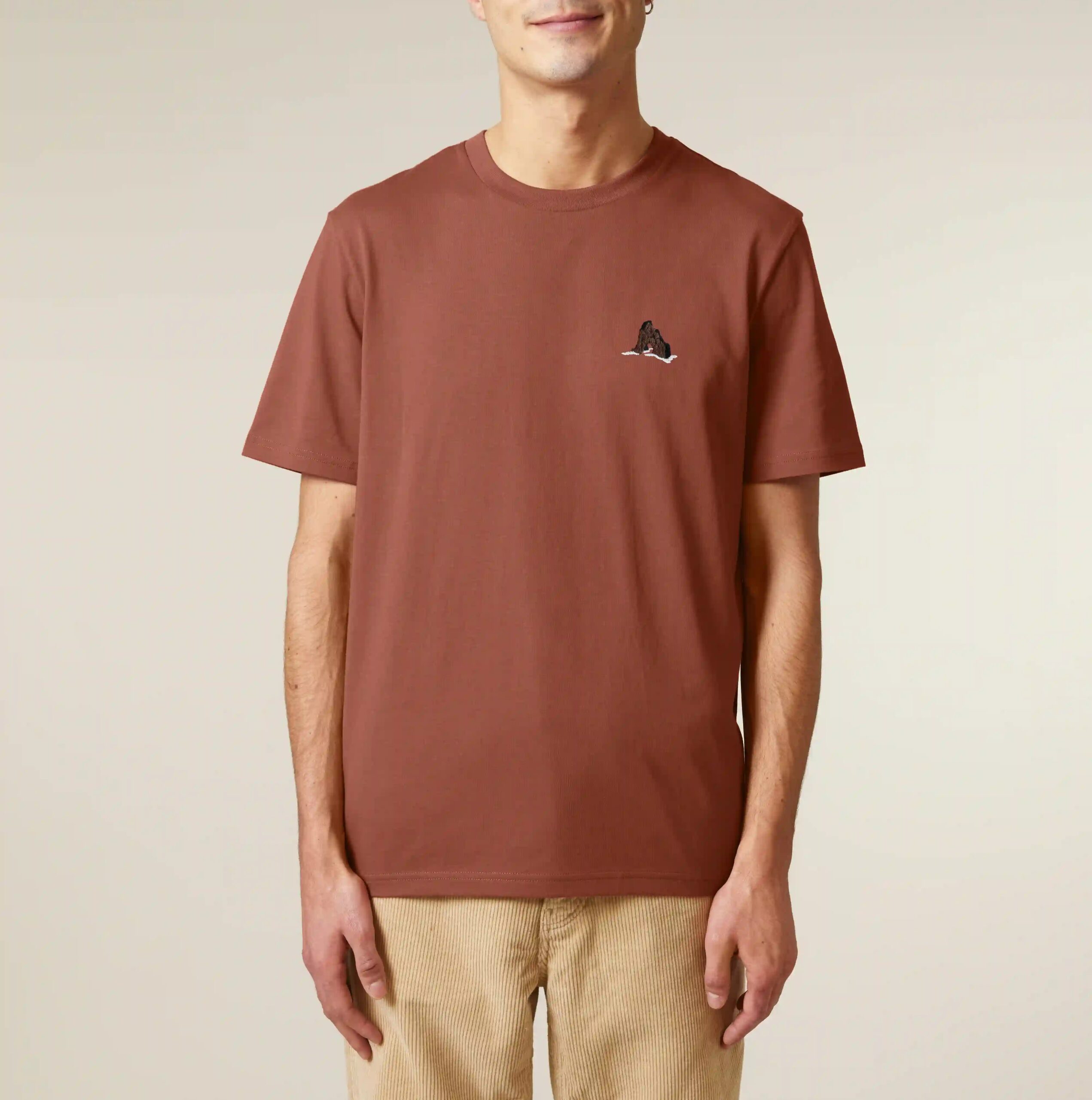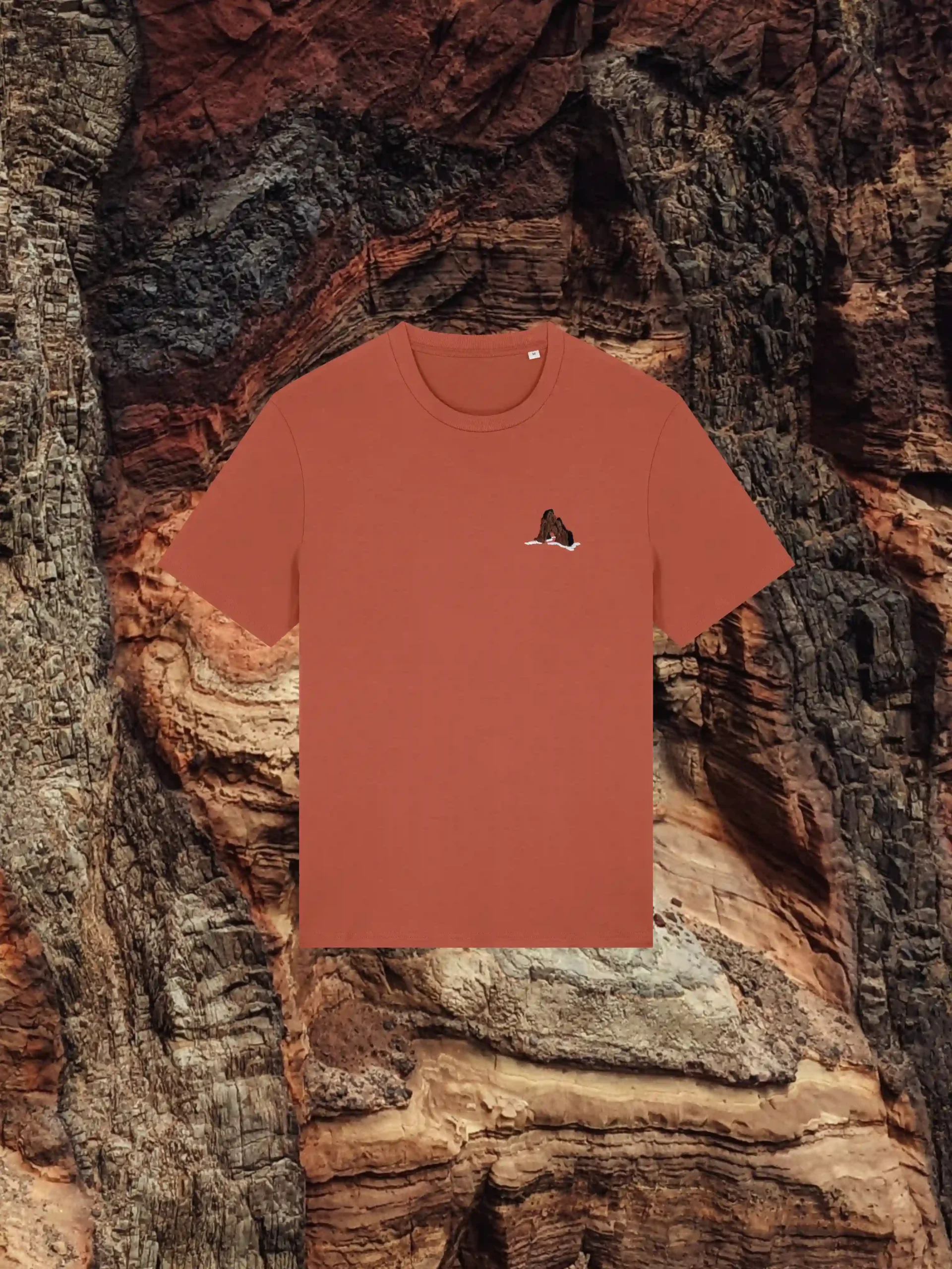 Os ilhéus de basalto e tufo que surgem dispersos ao longo da costa da Madeira, são vestígios da origem vulcânica da ilha. Inspirada por estes rochedos que marcam a paisagem e a identidade madeirense esta T-shirt vermelho-tufo, bordada à mão, evoca a força e a beleza destas formações naturais.
